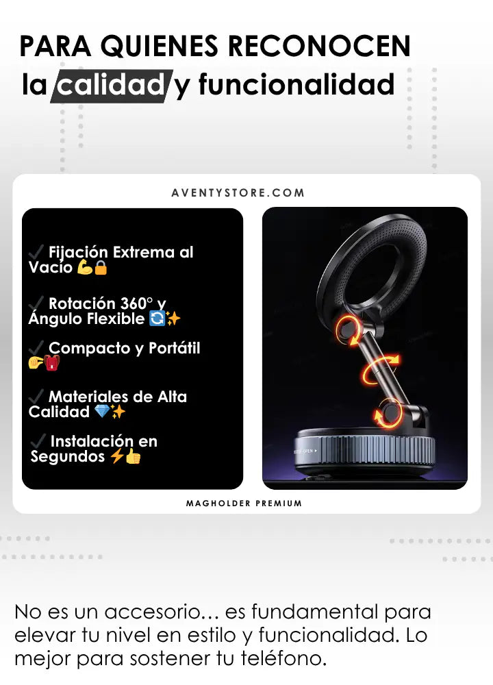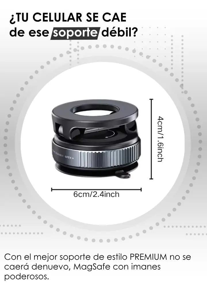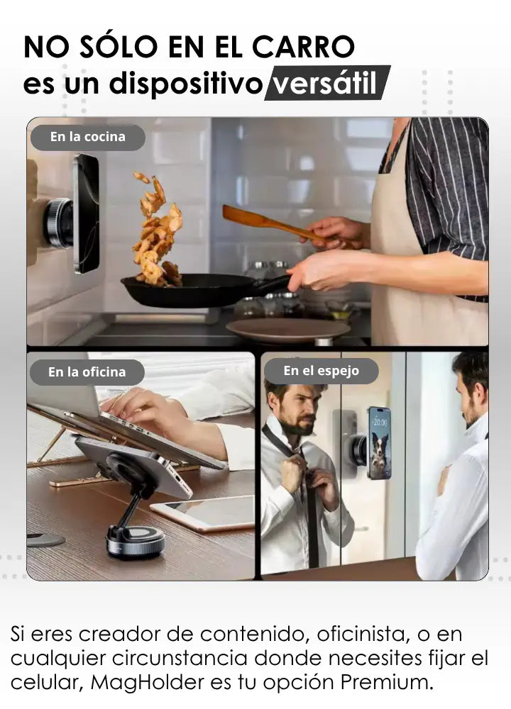 Sí, MAGHOLDER funciona con cualquier celular gracias a su base magnética y la placa metálica incluida para equipos que no tienen MagSafe